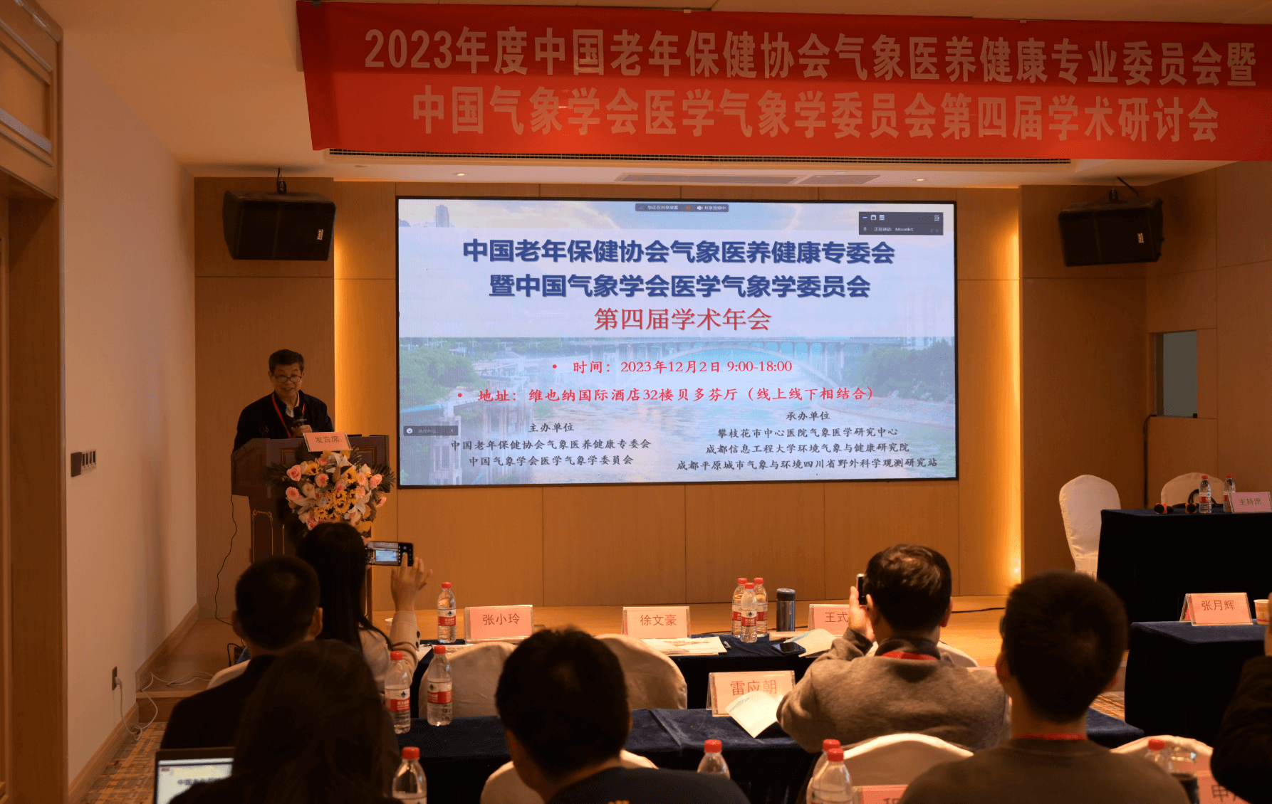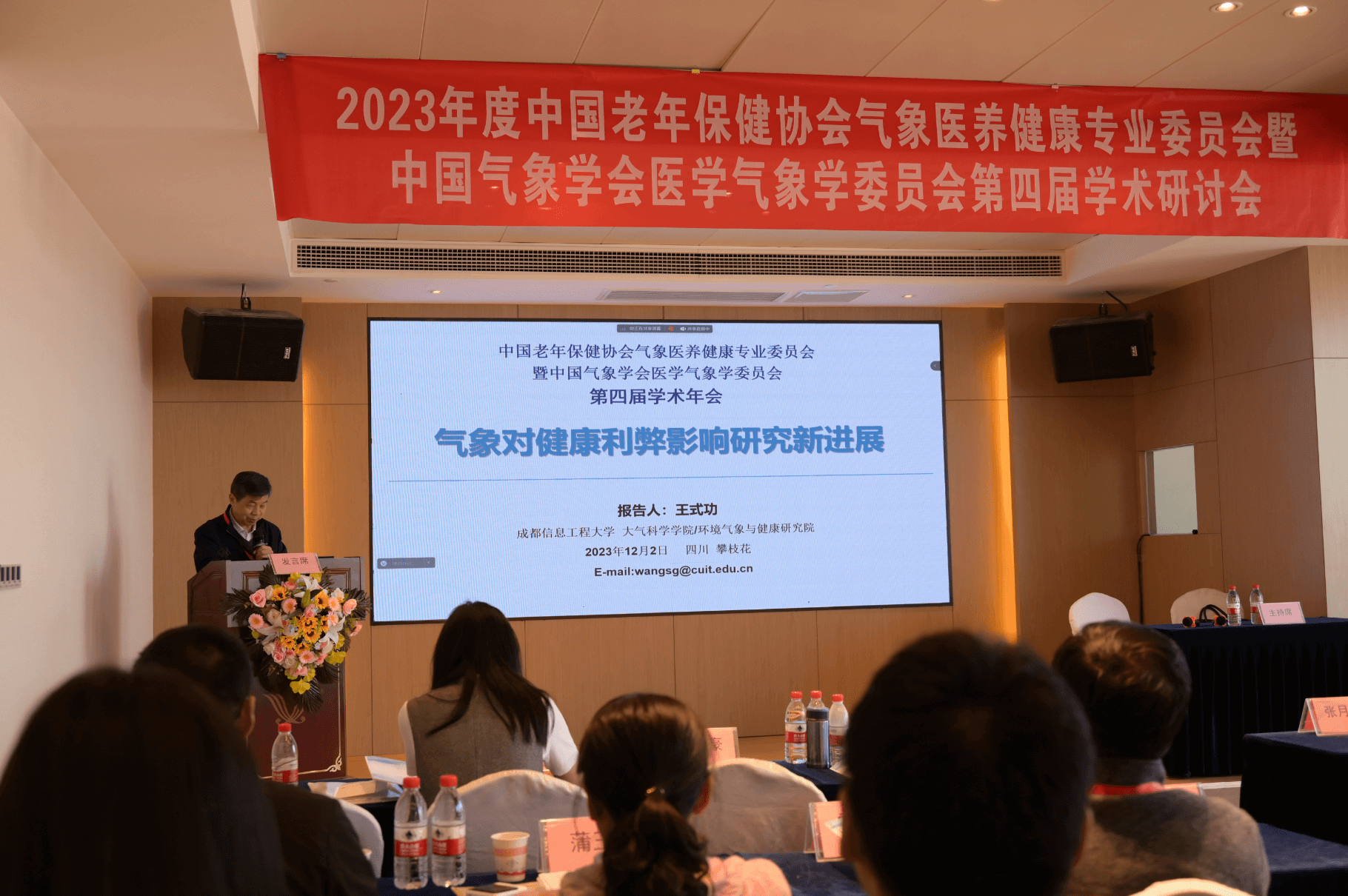 2023年12月2日,中国老年保健协会气象医养健康专委会暨中国气象学会医学气象学委员会2023年度学术年会,在阳光之城四川省攀枝花市成功召开。会议以线下会场为主,线上同步进行的方式举行。本次年会由成都信息工程大学大气科学学院环境气象与健康研究院、成都平原城市气象与环境四川省野外科学观测研究站、以及攀枝花市中心医院气象医学研究中心联合承办,中国老年保健协会俞华副会长、中国气象学会王金星秘书长、气象医养健康专委会辛金元秘书长、医学气象学委员会马玉霞秘书长、我校王式功教授(两会主任委员)、张小玲教授、马盼博士、张莹博士等以及来自全国的两会委员、专家、学者和研究生参加了本次会议。